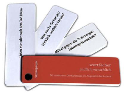 Gemeinsam mit dem Verlag vatter & vatter konnte eine Wortfächer-Publikation entwickelt und umsetzt werden, die auf niederschwellige und spielerische Weise das Sprechen und Nachdenken über das «Unsagbare» – den Tod, das Sterben, den Abschied – erleichtert sowie eine Verbindungslinie zwischen Leben(-ssinn)